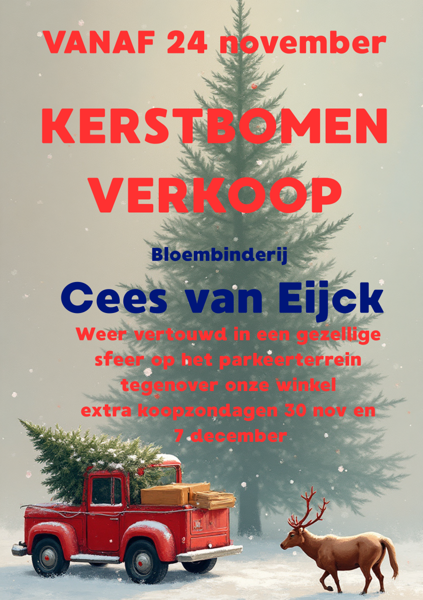 Kerstbomenverkoop vanaf 24 november op het parkeerterrein tegenover onze winkel,